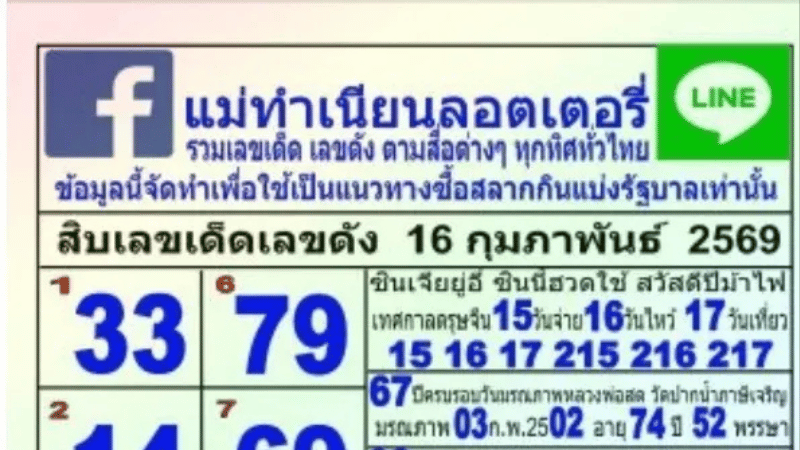 🔥 โพยมาไว! 10 เลข “แม่ทำเนียนลอตเตอรี่” งวด 16 ก.พ. 2569